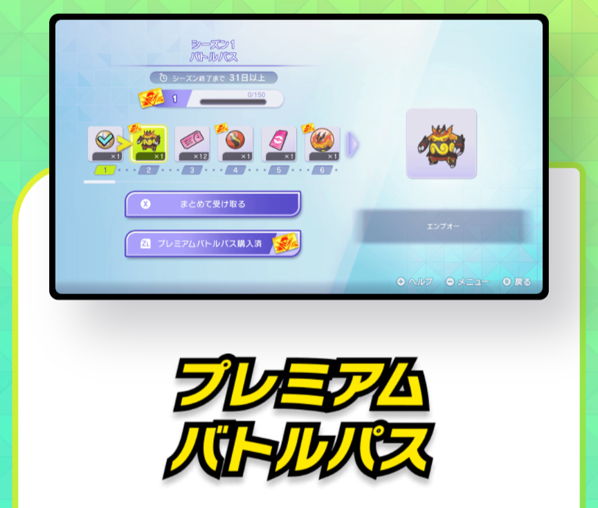対戦をたくさん行うことによって通常よりも豪華な報酬が解放されます。本来VPにより貯めて交換する「メガストーン」などが直接手に入るため、育成の時間を大幅に短縮できます。このプレミアムバトルパスは1シーズン1400円かかるため、毎シーズン購入となります。